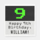 Ce design de serviette en papier geek et amusant sur le thème de l'anniversaire est doté d'un grand modèle de jeu vidéo classique vert numéro "9" sur un arrière - plan de couleur noire. Il contient également le message de voeux d'anniversaire "Happy 9th Birthday," et un nom qui peut être modifié. Des serviettes en papier sur le thème de l’anniversaire comme celle-ci pourraient être amusantes à utiliser lors d’une fête organisée pour célébrer le neuvième anniversaire de quelqu’un. [~Z0000404]