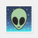 Une tête alien verte avec de grands yeux noirs ovales et une petite fente noire pour une bouche. L'arrière - plan est un dégradé foncé à bleu clair, parsemé d'étoiles blanches.