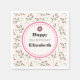Serviettes d'anniversaire avec votre texte personnalisé à l'intérieur d'un cadre blanc en coquille d'oeuf avec une bordure en pointillé rose. La toile de fond est un motif de fleurs sauvages roses dessinés à la main avec de longues tiges vertes et des feuilles sur une toile de fond blanche en coquille d'oeuf. Des cercles roses et des sprigs décorent également le design. Design Whimsical et joli à fleurs. Personnalisez avec votre propre texte.
