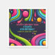 Une invitation dynamique et ludique à l'anniversaire avec un design psychédélique et d'inspiration rétro. L'arrière - plan sombre est décoré de formes colorées et tourbillonnantes, de lignes abstraites et de touches de couleurs vives rappelant les années 1970. La bordure est un motif amusant de visages souriants multicolores, avec des étoiles et des bulles éparpillées dans le design. Le texte est un mélange de polices audacieuses et ludiques, avec des détails clés surlignés en bleu vif et rose.