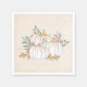 Serviettes en papier avec citrouilles blancs à l'aquarelle fantaisie aux accents de parties scintillant en faux or. Entouré de feuilles verts et de fleurs sauvages roses.