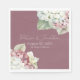 Ces serviettes romantiques à mariages floraux sont ornées d'hydrangées rose et blanche aquarelle sur un arrière - plan roux poussiéreux. Un délicat bouquet de fleurs d'hydrangée est représenté sur le dessus, et un autre au fond. Un exemple de nom de couple est imprimé au centre dans une police de script élégante, suivi d'une date et d'un emplacement mariages.