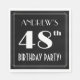 Ce luxueux style années 1920/1930 a inspiré le design de serviette de fête de quarante-huitième anniversaire avec un nom modifiable, un look art déco fantaisie inspiré numéro "48th", le message "BIRTHDAY PARTY!", et une frontière multi-lignes. L'arrière - plan est coloré en noir par défaut, mais il peut être customisé à une couleur différente, si désiré. Des serviettes en papier comme celles-ci peuvent être utilisées pour organiser une fête d'anniversaire pour quelqu'un en l'honneur de son 48e anniversaire. [~Z0000612]