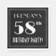 Ce design élégant de papier de célébration de cinquante-huitième anniversaire comporte un nom personnalisé, un look art déco fantaisie inspiré du numéro "58e", le message "FÊTE D'ANNIVERSAIRE !", et une bordure multiligne. Il y a un arrière - plan de couleur noire par défaut, mais il peut être customisé à une couleur différente, si désiré. Des serviettes en papier comme celles-ci peuvent être utilisées pour célébrer le cinquante-huitième anniversaire de quelqu’un. [~Z0000612]