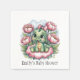 Un charmant dinosaure vert aux grands yeux expressifs surplombe un nuage rose moelleux, entouré de fleurs roses vives, de pétales détaillés et de centres jaunes vifs. Orné d'un joli arc rose, le dinosaure porte un doux sourire, ajoutant à l'atmosphère rêveuse et fantaisiste. L'arrière - plan bleu et blanc doux et nuageux améliore la scène enchanteresse, ce qui en fait un design parfait pour un baby shower célébrant une petite fille.
