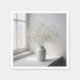 A white vase filled with delicate white gypsophila flowers sits by a window where natural light casts gentle shadows and a faded rainbow, enhancing the serene ambiance