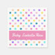 Serviettes pois à bande rose coloré - arrière - plan blanc avec des pois mignons et colorés enveloppés dans une bande de rose. Texte personnalisé pour quiconque attend ou célèbre la naissance d'un bébé. Serviettes sucrées pour un baby shower ou une fête d'accueil pour bébé. Vous pouvez modifier le style et la couleur de la police.