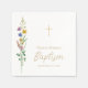 Cette serviette en papier Baptême fleurie présente des fleurs sauvages et une croix avec une typographie stylisée. Facile à personnaliser. Aquarelle originale © Michele Davies.