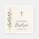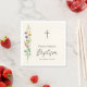 Cette serviette en papier Baptême fleurie rustique présente des fleurs sauvages et une croix sur un arrière - plan crème tendre. Facile à personnaliser. Aquarelle originale © Michele Davies.