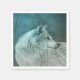 Des serviettes en papier avec une photo d'un magnifique loup gris et velouté. Dans l'arrière - plan est une forêt sombre avec des arbres. Vibe mystique magique.