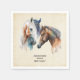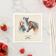 Serviettes en papier avec un beau dessin aquarelle. Avec une paire de chevaux, brun et blanc. Tête et cou visibles avec de la peinture goutte le long de la base de leur cou. L'ambiance du sud-ouest.
