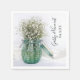 L'élégante White Baby's Breath in Blue Vase Papier Mariage Napkins peut être personnalisée avec les noms de la mariée et du marié et date à utiliser à votre jardin d'été douche nuptiale ou mariage cocktail et réception. Ces serviettes jetables à fleurs chic et rustiques sont ornées d'une photographie florale d'un pot en verre bleu rempli de fleurs à l'haleine de bébé blanc ou de Gypsophila paniculata et satin blanc.