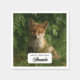 Serviettes en papier avec une photo montrant un mignon petit renard à fourrure rouge et blanche. Entouré de feuilles et d'herbes verdoyants.