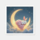 Un lapin blanc moelleux est enveloppé doucement dans une couverture rose, reposant paisiblement sur une lune de croissant brillante dans un ciel nocturne onirique. Peut être utilisé pour une douche bébé fille.