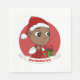 Serviettes avec l'illustration d'un joli sourire joyeux bébé fille ou garçon noir, le bébé porte des vêtements rouges et blancs et tient un cadeau; avec texte modifiable modèle pour votre nom ou message, Noël fêtes design
