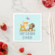 Des serviettes en papier d'anniversaire avec une jolie illustration représentant un cerf de bébé et un petit écureuil tenant un cordon et un papillon volant au-dessus de leur tête. Ces adorables créatures boisées se tiennent debout sur une herbe avec quelques champignons fantaisistes à leurs pieds. Arrière - plan bleu clair.
