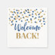 Bienvenue serviettes de retour avec l'or et le motif confetti bleu.