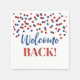 Bienvenue serviettes avec motif confetti rouge et bleu.