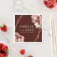 Romantic boho wedding napkin featuring gold frame accents and burgundy watercolor florals on a deep rosewood background — perfect for elegant receptions.