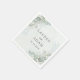 Elegant boho wedding napkins feature romantic eucalyptus in a delicate shade of sage green and simple, stylish dark green typography script on a watercolour background, complemented by rustic sage green eucalyptus leaves. Customise with your unique details..