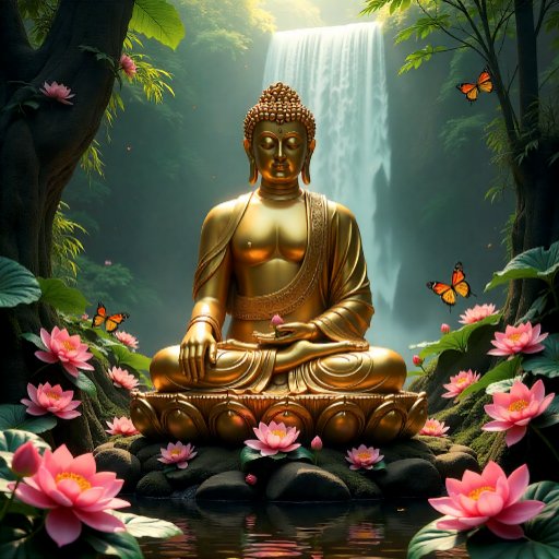 Bouddha tranquille méditant dans la forêt sous la cascade et entouré de fleurs de lotus et de papillons.