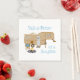 Serviettes de camping avec photo de remorque 5ème roue. Dire est "La vie est meilleure dans un camping" et est personnalisable. Une image RV bronzée et argentée avec feu de camp et chaise vide est imprimée au centre avec du texte de police bleu tourbillonnant imprimé en haut et en bas. Les serviettes en papier ont des options de couleur et de taille.