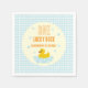 Un canard chanceux ! Premier anniversaire avec canard en caoutchouc et bulles contre un en vichy bleu clair et arrière - plan jaune pâle avec texte orange