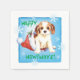 Célébrez la saison des Fêtes avec un mignon chiot Cavalier King Charles Spaniel assis dans un chapeau de Père Noël au milieu des flocons de neige et les mots, Happy Howlidays!