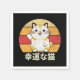 Illustration colorée avec design de texte "Chat chanceux" en japonais et un chat Kawaii soulevant une décoration de main sur arrière - plan rétro rayé