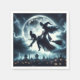 Une sorcière aux cheveux flottants et un casquette pointu vole gracieusement à travers le ciel éclairé par la lune sur un balai accompagné d'un chat noir