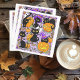 Chats noirs mignons parmi les citrouilles, bonbons d'halloween, chauves-souris, balai, étoiles, maïs bonbon, glands, pleine lune, feuilles d'automne et un fantôme coupé, le tout dans un décor violet clair