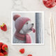 Un chien blanc moelleux dans un casquette tricoté rouge et foulard a sa langue collée à un poteau métallique gelé pour Noël.
