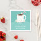 Serviettes en papier de Noël Hot Chocolate Party qui comportent une tasse souriante de cacao chaud avec un sucre de canne et plusieurs guimauves joyeuses sur un arrière - plan turquoise. Tous les mots peuvent être customisés.