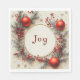 Pretty Christmas paper napkins with red ornaments pine branches, red berries and gold glitter snowflakes.