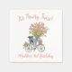 Ces serviettes présentent un portrait aquarelle d'un mignon petit chiot assis sur un vélo avec un grand bouquet de fleurs roses et des arcs bleus et blancs.