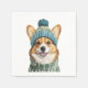 Illustration de charme d'un corgi joyeux portant un pull tricoté douillet et une beanie bleue et verte assortie avec un pom-pom. Les yeux brillants et l’expression joyeuse du chiot font de cette image une image parfaite pour les amateurs de vibes d’hiver et les amoureux des animaux de compagnie.