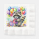 Raton laveur doux tenant un cadeau d'anniversaire entouré de ballons d'anniversaire en bleu, jaune, vert, violet et rose. Ces serviettes en papier sont mignonnes pour une fête d'anniversaire à thème Woodland ou pour tout enfant qui aime les ratons laveurs !