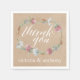 Ces serviettes sont parfaites pour tout couple qui planifie une fête romantique de mariage campagnard. La conception comporte une couronne fleur sauvage tendance sur un arrière - plan à effet kraft avec une formulation coordonnée couleur. Le design simple peut être personnalisé pour convenir à votre événement spécial et sera l'accessoire parfait pour toute soirée à thème floral chic, y compris : douches nuptiales, fiançailles, wedding showers, fêtes d'anniversaire et bien plus encore.