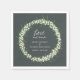 Belle florale du début du printemps acacia fleurs aquarelle mariage amour et merci dessous de verre en papier. Un grand ajout personnalisé à vos tables de mariage ou pour des boissons après-mariage. De jolies serviettes à fleurs fleuries avec une couronne de fleurs crème sur un arrière - plan vert foncé. Personnalisez avec les noms de votre mariée et de votre mariée et la date du mariage. Parfait pour un mariage de fleurs de printemps. D'autres articles correspondants sont disponibles. Unique peinture et design original de fleurs aquarelles par Sarah Trett. www.mylittleedenweddings.com