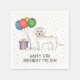 Décor d'anniversaire adorable avec dessin animé original de Destei illustrant un mignon manteau couleur crème miniature chien de race Goldendoodle. A côté du chien il y a des ballons colorés d'anniversaire attachés sur un os de chien et une boîte cadeau de couleur violet et jaune. L'arrière - plan a un motif ludique de confettis pastel colorés sur un arrière - plan blanc. Vous trouverez également une zone de texte personnalisable.