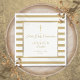 Serviette en papier élégante dorée et blanche rayée pour la Première Sainte Communion avec une croix dorée et une bordure de faux foil doré chic qui encadre les détails de l'événement de célébration dans un texte moderne. Personnalisez avec le nom de votre enfant et la date spéciale. Conçu par Thisisnotme©