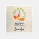 Serviettes en papier de fête personnalisées avec un rectangle couleur crème aux formes géométriques tendres. En haut, un dessin animé représentant un mignon renard orange dormant tranquillement. Un feuille vert courut derrière.