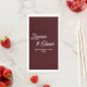 Elevate your wedding reception with our exquisite Deep Burgundy Script Minimalist Wedding Paper Guest Towels. Customized with the names of the bride and groom and the special date, these towels add a personalized touch to your celebration.