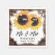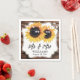 Serviettes en papier mariage de tournesol rustique avec deux tournesols et lampes à cordes contre un arrière - plan en bois de grange. Pays rustique M. et Mme mariage serviettes en papier avec tournesol.