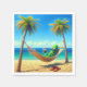 Paquet vert décontracté dans un hamac avec un cocktail tropical accroché entre deux palmiers tropicaux sur une plage aux tongs.