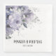 Une serviette mariage brillante en argent et en mauve avec une aquarelle fleurie de pivoines mauves et une verdure d'eucalyptus gris argent avec éclaboussures et des éclaboussures de points d'encre argent avec vos noms et détails dans une police san serif moderne.