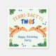 Drôle dinosaure 2ème anniversaire serviettes de fête avec des couleurs bleu vert et orange et thème safari. Personnalisez-le avec les détails de votre événement. Conception Unisex pour un garçon ou une fille.