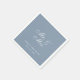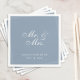Serviettes mariages pour mariage de couleur mariage bleu poussiéreux. Texte blanc sur arrière - plan bleu poussiéreux. Les mots "M. & Mme" sont écrits dans un élégant script calligraphique, les noms de la mariée et du marié et la date en casquette plus petits.