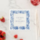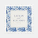 This elegant wedding napkin features a classic blue floral pattern with large, detailed flowers and leaves in various shades of blue, creating a rich tapestry effect. The central white square showcases customizable text in a sophisticated serif font, bordered by the intricate design that evokes a vintage porcelain aesthetic. Perfect for adding a touch of tradition and refinement to your special day, this design captures the beauty of florals in a structured and balanced layout, ideal for formal celebrations.