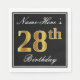 Cette conception simple et élégante de serviette en papier comporte un message comme "Name-Here’s 28th Birthday" (avec le "28th" ayant un faux look doré) dans une zone carré de couleur noire avec un contour de bordure simple. Le nom est dans un texte de type script de couleur blanche, et peut être customisé. Des serviettes comme celles-ci pourraient être utilisées à une fête d'anniversaire pour quelqu'un qui fête son vingt-huitième anniversaire. [~Z0000136]